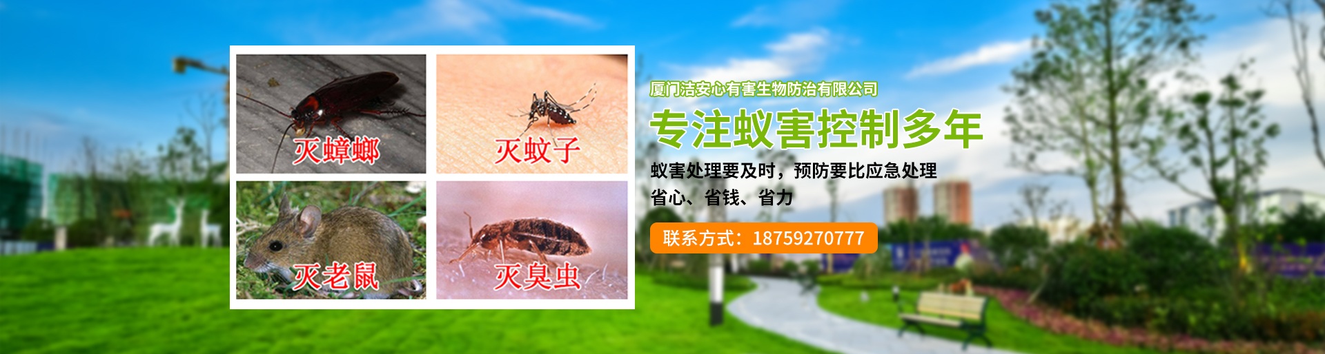 廈門潔安心有害生物防治有限公司成立于2020年是一家專業的PCO有害生物防治服務機構,是經廈門市工商局注冊登記、廈門市白蟻防治管理所、PCO協會批準的城市害蟲綜合治理公司,專業殺臭蟲、殺白蟻、殺蟲、滅老鼠的公司,是集廈門白蟻防治、廈門殺蟲、滅鼠滅四害、廈門殺臭蟲、廈門殺白蟻、廈門滅蟑螂治理銷售于一體的大型專業廈門有害生物環保服務公司。主要從事新建、擴建、改建、裝飾裝修單位建筑物的白蟻防治和白蟻預防工程,同時從事工廠、酒店、企事業單位、住宅小區和家庭的”四害”滅治和白蟻防治服務,長期向各類型客戶提供廈門白蟻防治、廈門殺蟲、滅四害,廈門殺臭蟲、廈門殺白蟻、廈門滅鼠等優質服務。